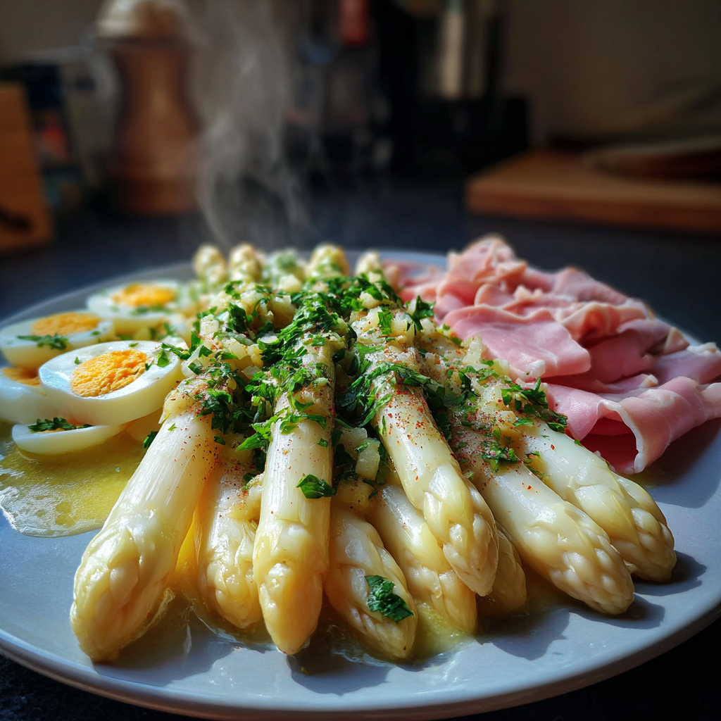 Stel u voor: de geur van vers gekookte asperges vult uw keuken. De zachte, bijna smeltende textuur contrasteert prachtig met de zoute ham en de romige botersaus. De frisse citroen en de subtiele nootmuskaat maken het gerecht helemaal af. De groene peterselie zorgt voor een visueel aantrekkelijke toets.