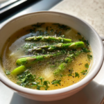 Deze heldere aspergesoep is een verfijnde en elegante soep, perfect als voorgerecht of lichte lunch. De heldere bouillon, gecombineerd met de delicate smaak van asperges, zorgt voor een heerlijke smaakbeleving. Eenvoudig te maken met verse ingrediënten en een snufje liefde.