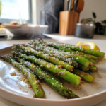 Stellen Sie sich vor, Sie servieren einen Teller mit leuchtend grünem Spargel, der mit einer leichten Knoblauchnote und dem würzigen Aroma von Zitronensaft überzogen ist. Die Textur ist genau richtig – leicht knusprig, aber dennoch zart und saftig. Der Duft von frisch geröstetem Gemüse erfüllt Ihre Küche und verspricht eine gesunde und köstliche Mahlzeit. Die Farben sind visuell ansprechend, das tiefe Grün des Spargels ergänzt durch goldene Ränder, die durch das Rösten entstehen.