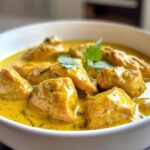 Een eenpansgerecht met malse kip in een romige curry-kokossaus.