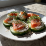 - Komkommer beleggen: Leg de komkommerplakjes op een schaal. Schep op elk plakje een beetje roomkaas.