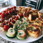 - Wrap Hapjes: Besmeer de tortilla wraps met roomkaas. Beleg met zalm of kipfilet, kruiden en komkommer. Rol strak op en snijd in plakjes.