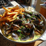 Een klassiek Belgisch gerecht: heerlijke mosselen gekookt in witte wijn, knoflook en kruiden, geserveerd met knapperige friet. Perfect voor een gezellige avond!