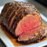 Dit is misschien wel de belangrijkste stap! Haal het vlees uit de oven en laat het minstens 10 minuten rusten onder aluminiumfolie. Zo trekken de sappen terug in het vlees – snij je het meteen aan, dan loopt al dat lekkere vocht eruit. Terwijl het rust, kun je de jus uit de pan opvangen om erbij te serveren. En dan… tadaa! Snij tegen de draad in in mooie plakken en serveer met trots. Klaar om je gasten te verbazen!