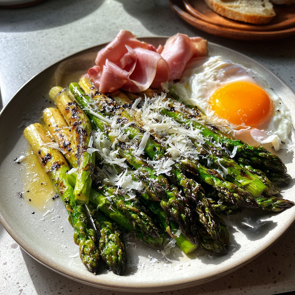- **Gebakken asperges:** Verdeel de asperges over een bakplaat en rooster ze 10-15 minuten in de oven, tot ze zacht zijn en licht gekleurd.