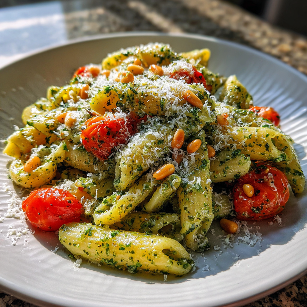 - Verdeel de pasta over borden en garneer met geroosterde pijnboompitten en geraspte Parmezaanse kaas. Serveer direct.